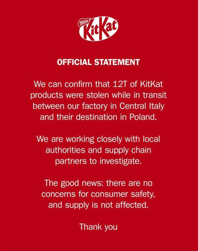I wonder if Kit Kat started April Fool’s Day a little early when they dropped an announcement about a heist! That’s right. One of their trucks were robbed.